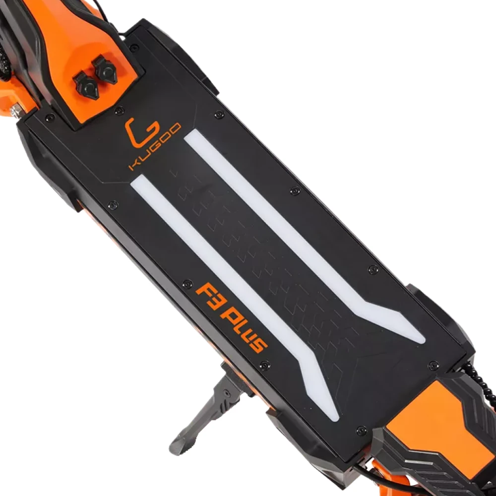 Kugoo F3 Plus рассчитан на нагрузку до 130 кг и покоряет подъёмы с углом до 25°. Широкая дека и руль (685 мм) делают поездку максимально удобной даже на дальние расстояния. Дисплей с бортовым компьютером отображает ключевые показатели: скорость, заряд, пробег.