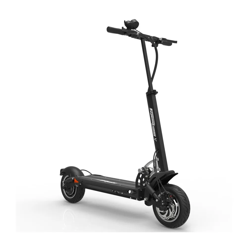 Заявленная максимальная скорость 65 км, это делает самокат скоростным, те кто любит быстрое движение, оценят. Широкие колеса 10 дюймов придают устойчивости и уверенности в повороте, на каждое колесо предусмотрен дисковый тормоз, есть функция рекуперации, ABS система.