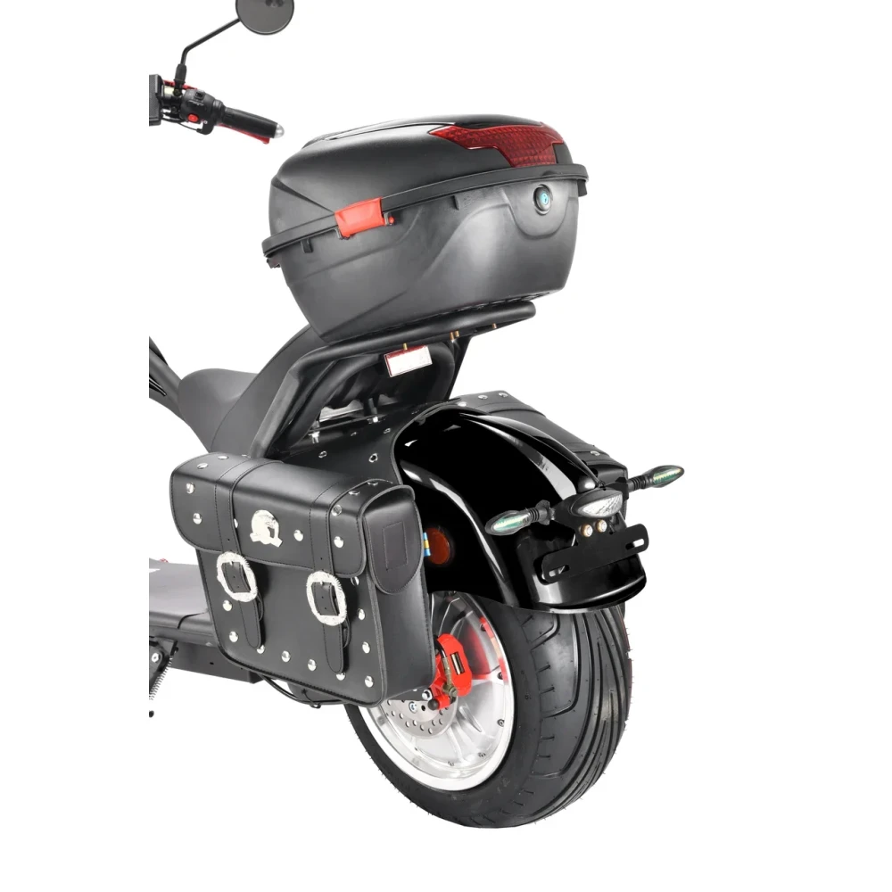 Модель оснащена 12-дюймовыми вездеходными колесами, позволяющими преодолевать препятствия по городской и непроходимой местности. Двигатель мощностью 3950 Вт допускает развитие скорости до 71 км/час. Мощное АКБ с полной зарядкой до 6 часов остается работоспособным до 40 км пути.