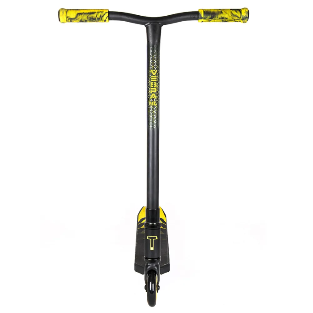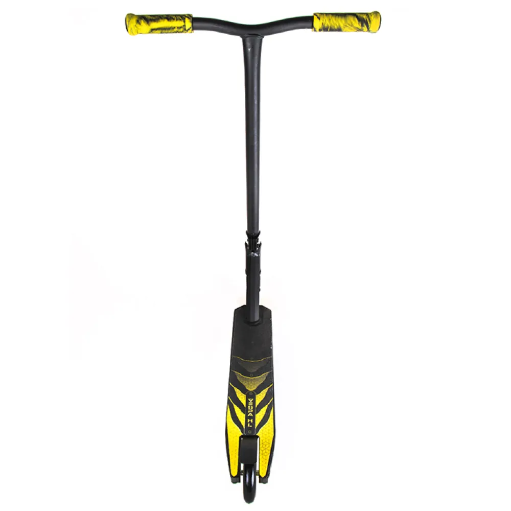 Произведенный в классически черном цвете самокат понравился отечественным пользователям и юным райдерам из СНГ благодаря техническим характеристикам. Простая в управлении техника обещает отличное время провождение, станет надежным другом в освоении новых навыков мастерства. Рулевая часть изготовлена из долговечной стали, дека – их легкого алюминиевая, по длине, ширине и расстоянии ног имеет размеры длину 48 см*10см*32,5см. Прорезиненные грипсы не допускают соскальзывание рук при исполнении трюков. 100-мм колеса в сочетании с учением райдера способны разогнаться до максимальных скоростей, сделать возможное, чтоб трюк состоялся.