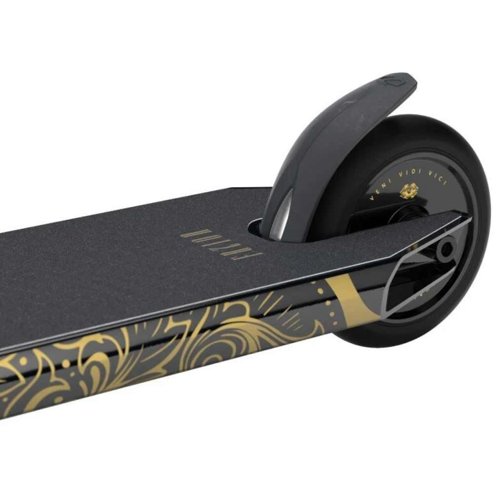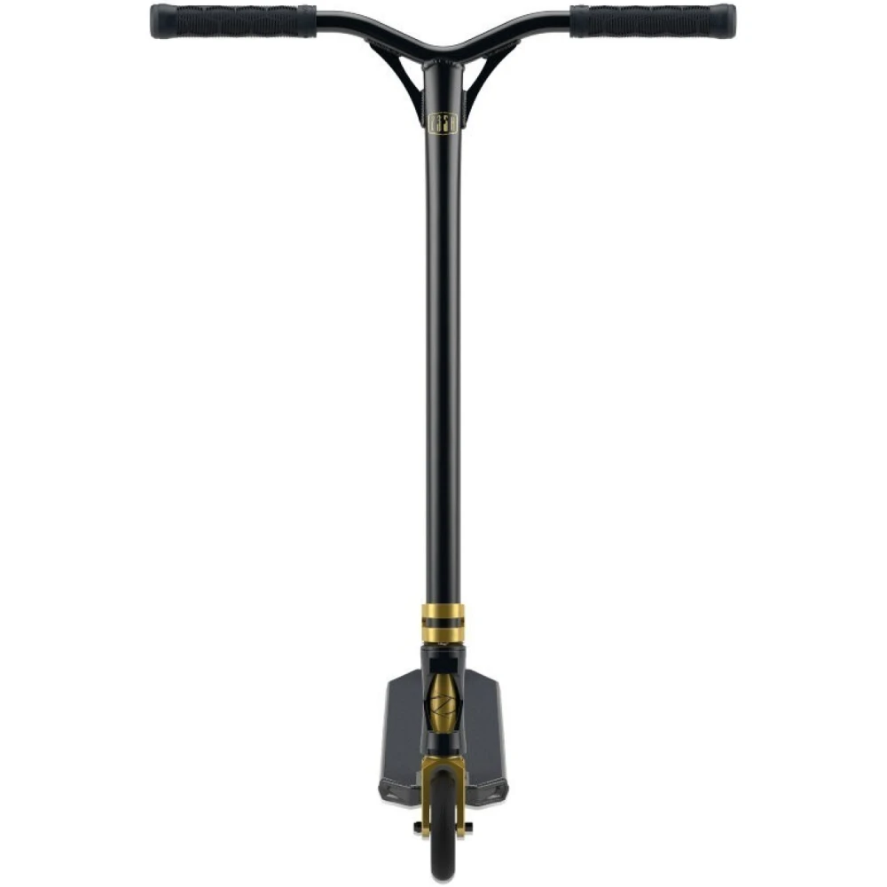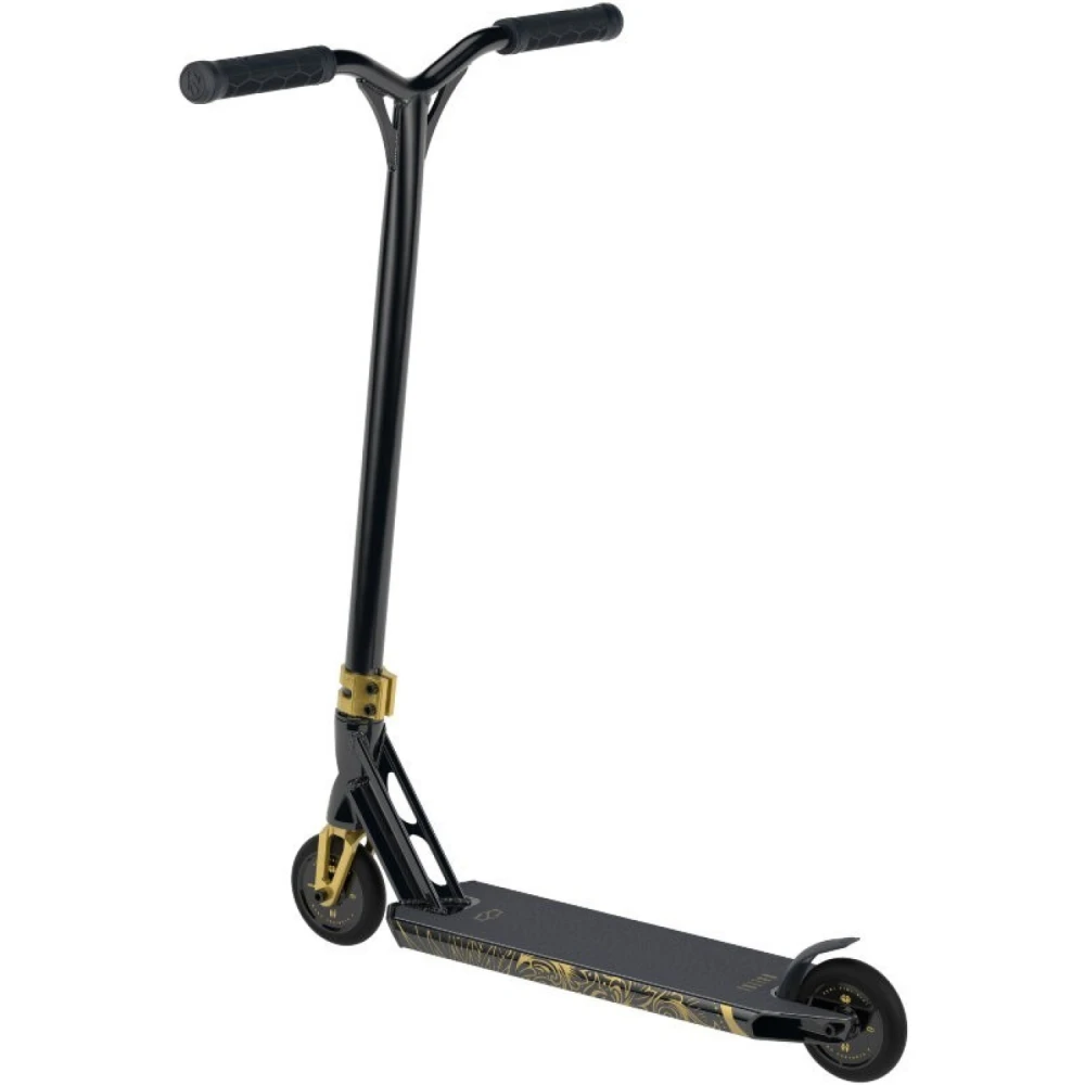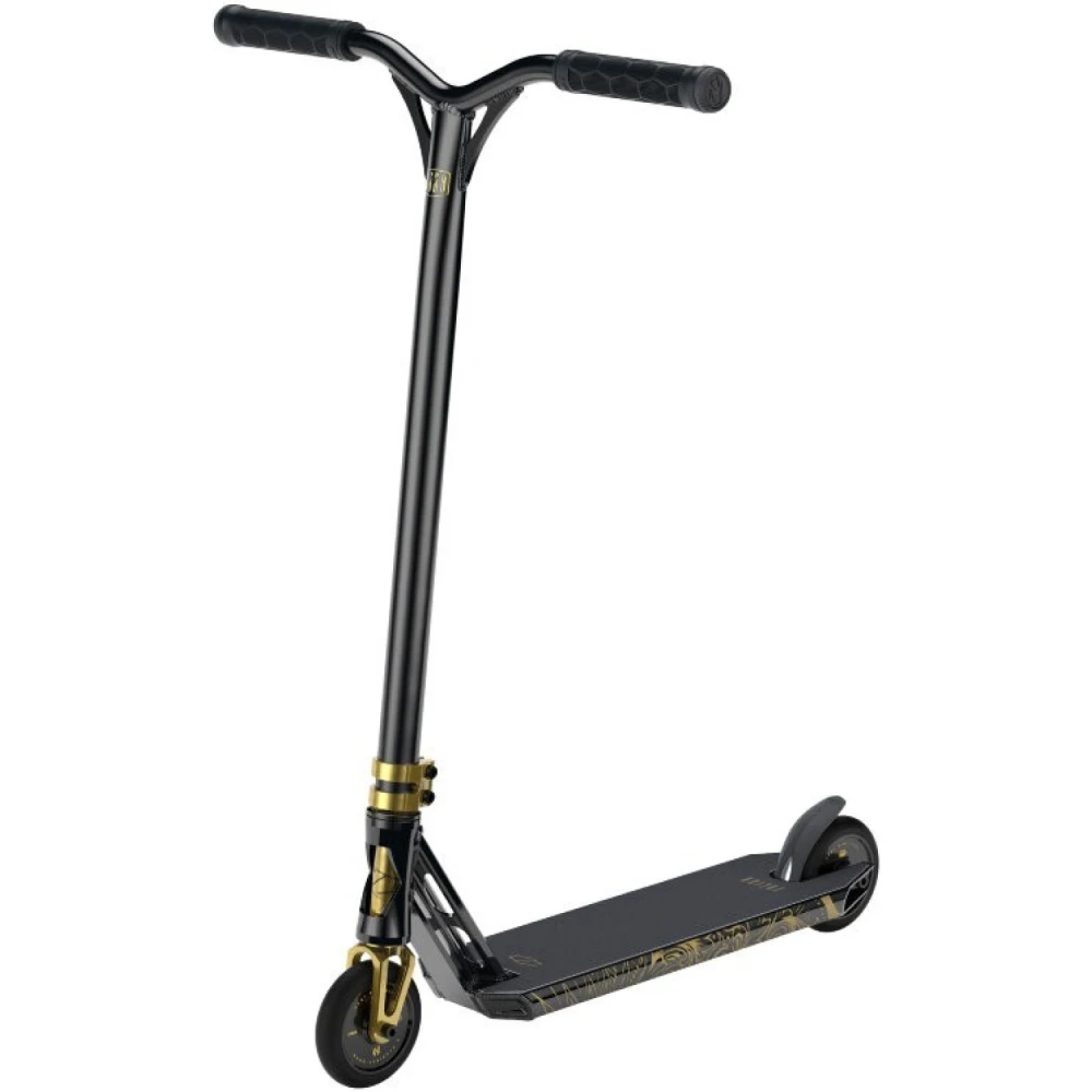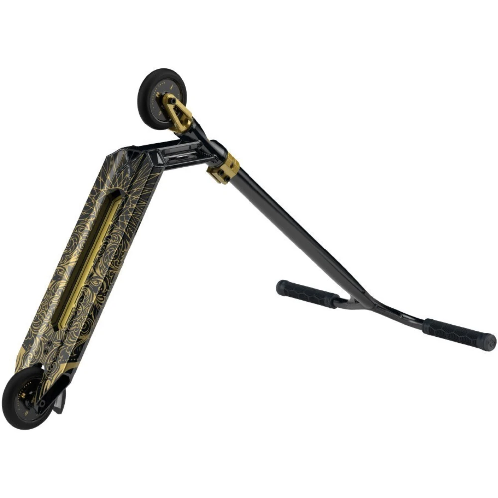 Техническая начинка подтверждает направленность и предназначение техники. Она рассчитана на профессионалов. Позволяет совершенствовать трюки, узнавать собственные возможности. Привлекательный современный дизайн вызывает зависть у других трюкачей. Золотой самокат представлен облегченной эргономичной конструкцией общим весом 3,27 кг. При этом максимальная грузоподъемность рассчитана на эксплуатацию тс взрослыми трюкачами. Широкая нескользящая дека, прорезиненные удлиненные грипсы исключают соскальзывание, увеличивают хват и уверенность пользователя в будущих действиях. Из других особенностей производитель выделяет деку, которая имеет конкейв 3° и угол наклона рулевого стакана 83°. Модель простая в использовании, стопроцентно слушается райдера.